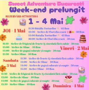Hai cu noi într-un week-end prelungit plin de culoare, joacă și gusturi delicioase… fără zahăr! Între 1 și 4 mai, la Sweet Adventure București, deschidem porțile Muzeului Dulciurilor fără Zahăr pentru distracție în familie. Pregătim ateliere creative pentru copii și părinți, concursuri amuzante, dulciuri sănătoase și multe surprize.