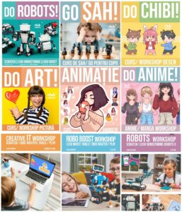În acest an, ne-am axat pe trei categorii de cursuri: ARTĂ, ROBOȚI ȘI PROGRAMARE și ȘAH & GO. Cursurile vor fi ținute în timpul săptămânii, iar workshop-uri le în weekend și au o durată de o oră, o oră și jumătate sau trei ore.