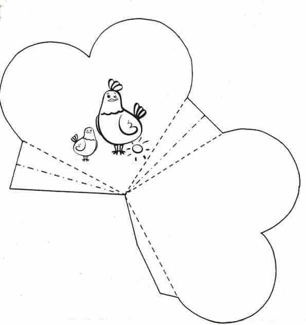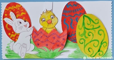 Sursa si modelul pentru imprimare: https://talentedenazdravani.eu/blog/2011/03/31/felicitare-de-paste-oua-pui-si-iepuras/.