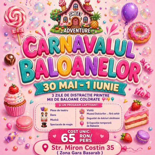 🥳 Sărbătorim 2 ANI de la deschiderea Sweet Adventure București! 🎂 Minivacanța de 3 zile vine cu o explozie de culoare și bucurie: baloanele dansează pe ritmuri vesele, magia îți șoptește la ureche povești nespuse, iar dulciurile sănătoase îți demonstrează că fericirea nu are nevoie de zahăr ca să fie autentică. Fiecare colț al Muzeului Dulciurilor va răsuna de râsete, fiecare balon va purta un vis, iar fiecare vizitator va pleca acasă cu inima mai ușoară și cu zâmbetul mai larg.