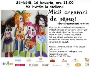Vă aşteptăm la atelierul nostru creativ predestinat copiilor cu vârste între 4 şi 8 ani, dar şi părinţilor lor. Vom petrece împreună o oră, creând cu ajutorul fetrului, pânzei, nasturilor şi a altor materiale interesante păpuşi haioase, sau personaje din poveşti.