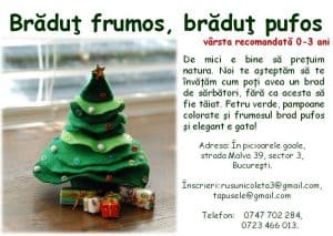 De mici e bine să preţuim natura. Noi te aşteptăm să te învăţăm cum poţi avea un brad de sărbători, fără ca acesta să fie tăiat. Fetru verde, pampoane colorate şi frumosul brad pufos şi elegant e gata!