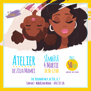 Adresat copiilor peste 4 ani, atelierul va cuprinde confectionarea unei felicitari colorate si a unei surprize pentru mamici.Materialele sunt incluse, distractia garantata si gustarica asigurata!. Dumneavoastra veti pleca acasa cu lucrarile realizate de copii, cu un zambet larg pe buze si cu energie pozitiva.Atmosfera din atelier este relaxata, copiii avand libertarea sa experimenteze lucrul cu diverse materiale. Parintii doritori se pot alatura lucrului.Detalii atelier special pentru ziua mamei:Pret: 50 leiLocatie: Str. Rotunda nr.4, bl.Y1A, sc.3Coordonator: Madalina MihaiTelefon: 0742.371.576E-mail: [email protected]