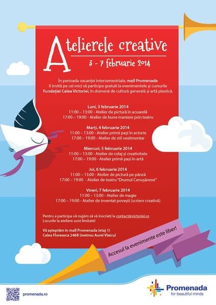 Fundatia Calea Victoriei alaturi de Mall Promenada invita copiii, in perioada 3 – 7 februarie, la o multime de Ateliere de creatie pentru copii cu intrare libera.