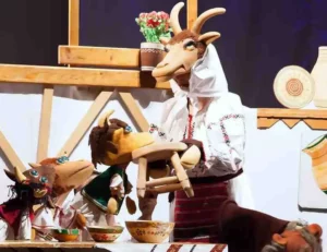 În spectacol apar actori la vedere, păpuşi mari şi măşti, într-un decor ce sugerează lumea satului românesc. Regizorul a tratat texul clasic în linie accentuat folclorică, de la décor la costumele stilizate ale personajelor, la diferitele obiecte sau la linia melodică. Este un mod de a ne aduce aminte de rădăcini.