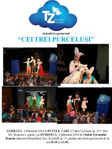 Teatrul Zurli aşteaptă toţi copiii si părinţii dornici de distracţie, la o versiune Zurli a poveştii clasice „Cei trei purceluşi”.