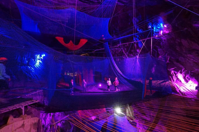 Bounce Below se găsește într-o fostă mină de ardezie, în nordul Țării Galilor. Copil sau adult, te poți juca, aluneca, rostogoli, sări și țopăi din plasă în plasă într-un spațiu de mărimea unei catedrale. Subteranul este adus din nou la viață, într-o atmosferă unică.