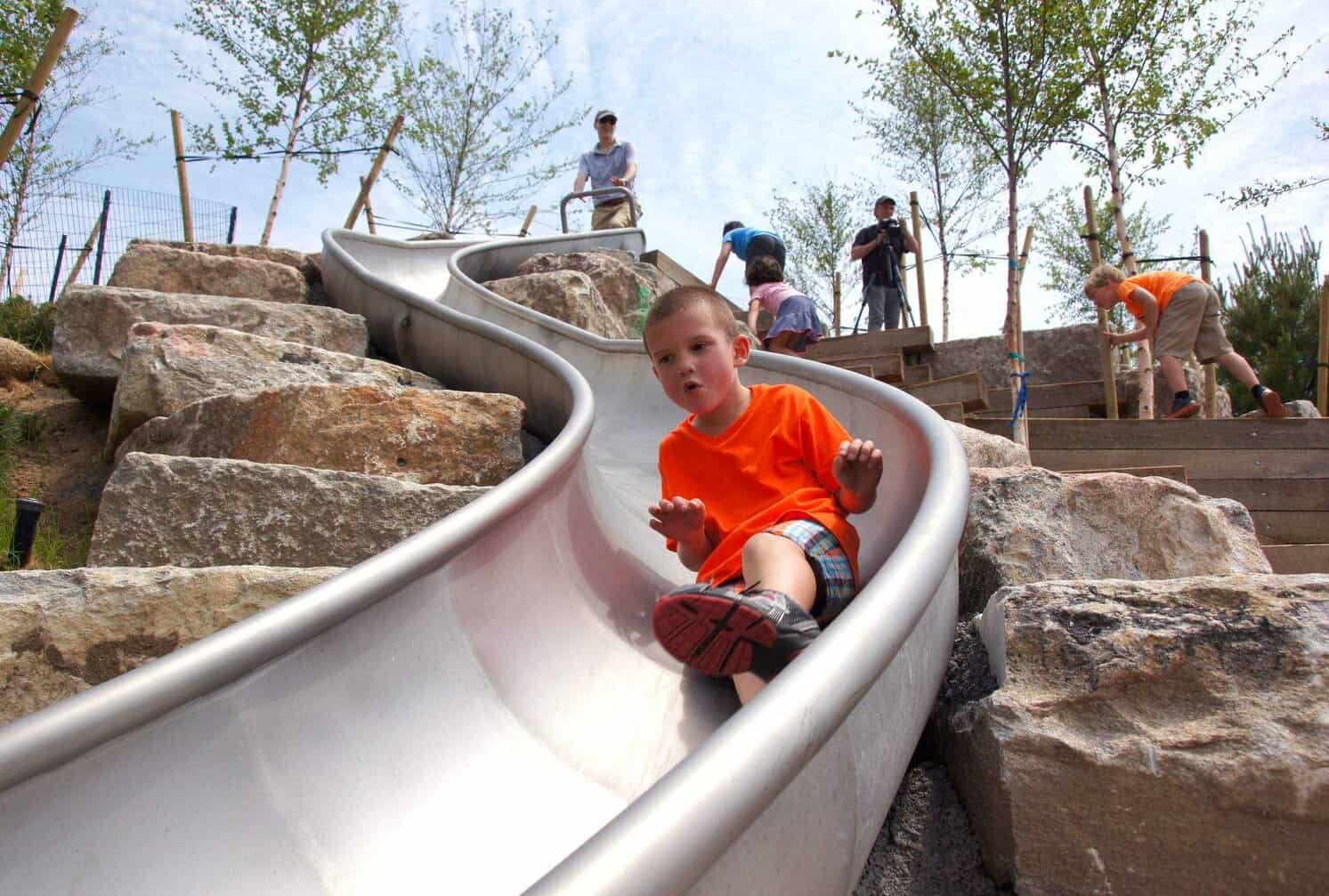 Slide Hill face parte dintr-un ansamblu de instalații care transformă cele 4 dealuri de pe Governor’s Island într-un adevărat loc de joacă. Tot 4 sunt și toboganele ce coboară de pe unul din dealuri, cele mai lungi din NY.
