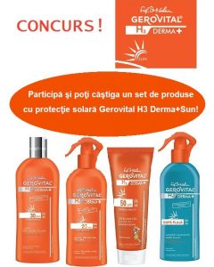 Participă la concurs și poți câștiga unul dintre cele trei seturi de dermatocosmetice marca Gerovital H3 Derma+ Sun format din Crema protecție solară copii SPF 50 Gerovital H3 Derma+ Sun, Fluid SPF 20 Gerovital H3 Derma + Sun, Lapte SPF 30 Gerovital H3 Derma+ Sun și Lotiunea după plajă Gerovital H3 Derma+ SUN.