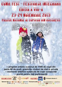 Asociatia CONIL – Centrul de Performanta, in parteneriat cu ISMB – Inspectoratul Scolar al Municipiului Bucuresti, are placerea sa anunte, pentru 23 si 24 noiembrie 2013, in sala mare a Palatului National al Copiilor din Capitala, o noua editie a CONILFEST – Festivalul Integrarii, editia a VIII-a.