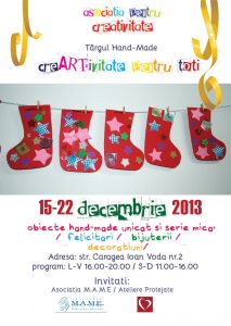 Dar asta nu este tot! Asociatia pentru Creativitate va organiza un targ cu vanzare de obiecte manufacturate la care vor participa si Asociatia M.A.M.E si Ateliere Protejate, cu scopul de a strange fonduri şi a sprijini dezvoltarea creativitatii copiilor bolnavi si fara posibilitati. Copilaria este perioada de maxima creativitate si trebuie sa le oferim celor mici mijloacele necesare pentru a si-o exprima.