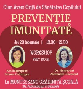 Vino pe 23 Februarie la primul workshop din Programul „Sanatatea Copilului”, cu tema Preventia si Imunitatea copiilor, sustinut de Dr. Alexandra Ghement si Kinetoterapeut Iulia Cotorogea.