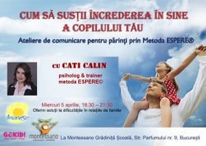 Miercuri, 5 Aprilie va invitam sa lucram pe situatii concrete timp de 3 ore, la atelierul "Cum să susții încrederea în sine a copilului tău", cu Cati Calin, psiholog și trainer în comunicare relațională prin Metoda ESPERE®. Vom descoperi impreuna solutii la provocarile cu care te confrunti zi de zi in relatia cu copilul tau. Vei afla cum să îţi sprijini copilul pentru a deveni un viitor adult independent, capabil să îşi realizeze întregul potenţial.
