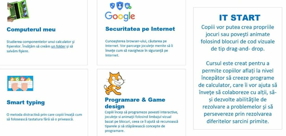 Cursul IT Start cls 0+1 este organizat sub formă de abonament lunar, cu durata sedinței de 60 min. Copiii lucrează individual, fiecare copil la câte un laptop, 10-12 copii la grupă.