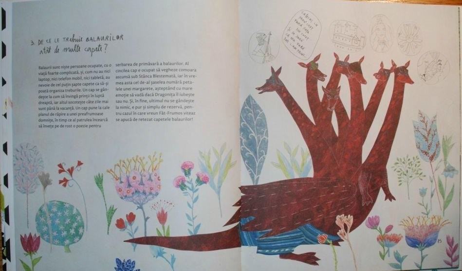 Astfel, aflăm din povestea „De ce le trebuie balaurilor atat de multe capete?” de ce balaurii au 7 capete și la ce le folosesc: un cap se gândește la cum să învingă prinții în luptă, altul păzește comoară de sub stâncă, al 3-lea învață o poezie pentru serbarea balaurilor, al 4-lea face planul cum să o răpească pe prințesa, etc. 🙂