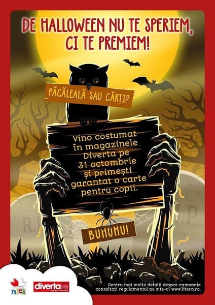 Orice copil care vine costumat în ziua de Halloween la Diverta și rostește formula magică Păcăleală sau cărți? primește din partea editurii câte o carte de povești care să-l facă să viseze frumos în fiecare seară.