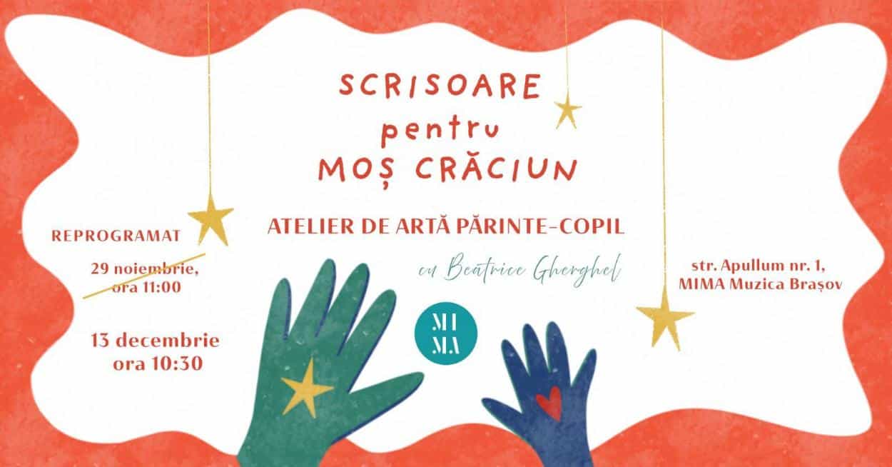 Ah, magia scrisorilor pentru Moș Crăciun! 🎄✨ La MIMA Muzica Brașov, atmosfera devine cosy și plină de inspirație într-un atelier gândit special pentru părinți și copii — un mic moment de încetinire, joacă și conexiune înainte de sărbători. Alături de artista Beatrice Gherghel, fiecare pereche părinte–copil va picta, desena, decupa și crea o scrisoare cu totul specială, personalizată și plină de emoție. Un atelier mic, cald, cu maxim 6 perechi, perfect pentru timp de calitate, colinde în surdină și momente care devin amintiri.