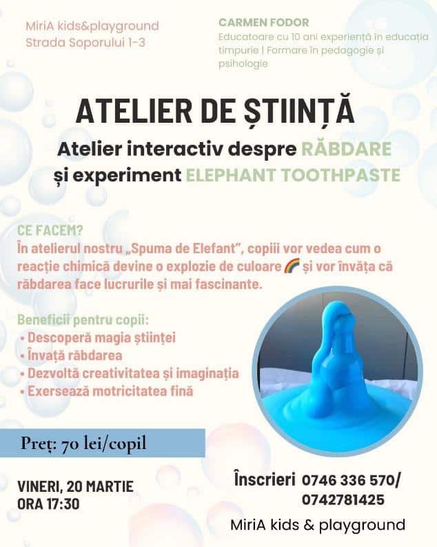 Prețul include apă și fructe pentru copii, cafea pentru părinți. Frații beneficiază de reducere de 10%. Doar 6 locuri disponibile.