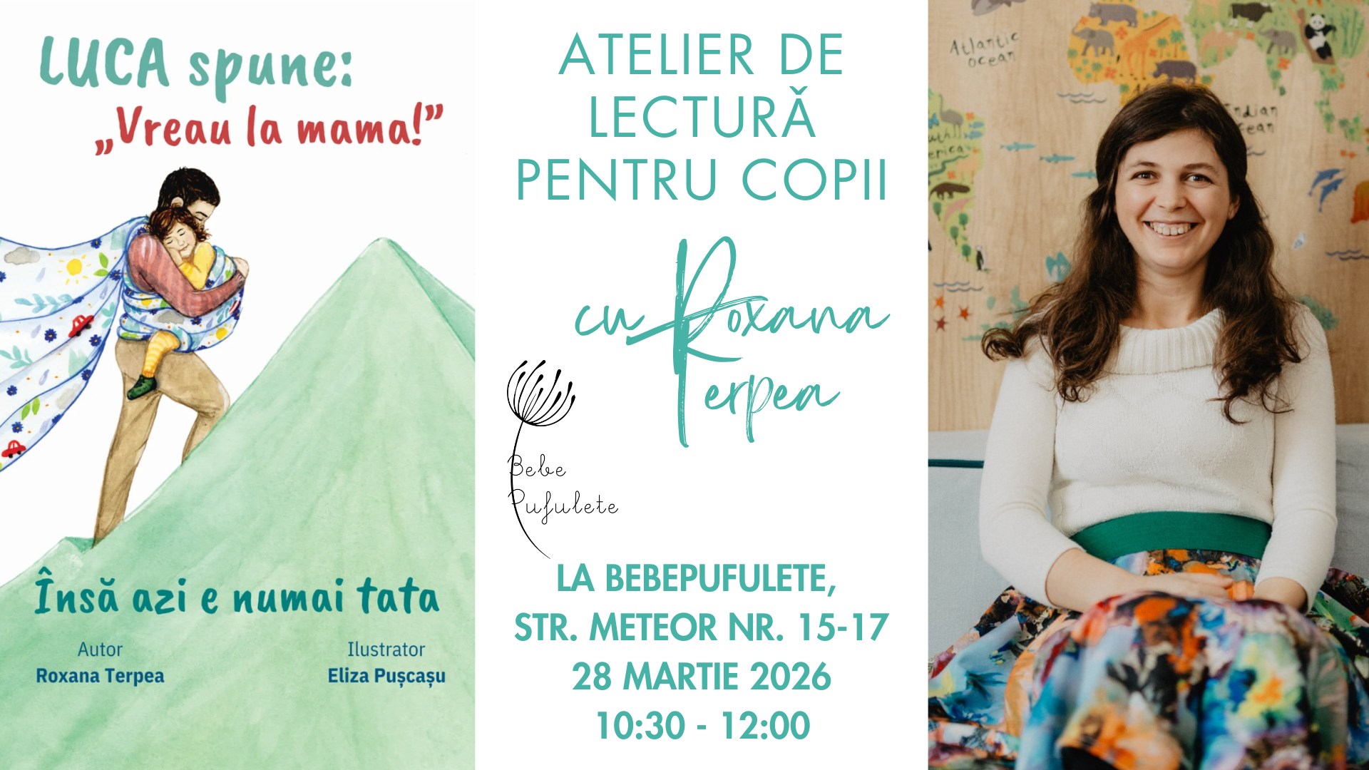 Un atelier special pornind de la cartea „Luca spune: vreau la mama. Însă azi e numai tata”, alături de autoarea și psihologul Roxana Terpea. Copiii trăiesc o experiență caldă și familiară prin lectură comună, în timp ce părinții participă la o discuție deschisă despre emoțiile copiilor și momentele dificile de separare.