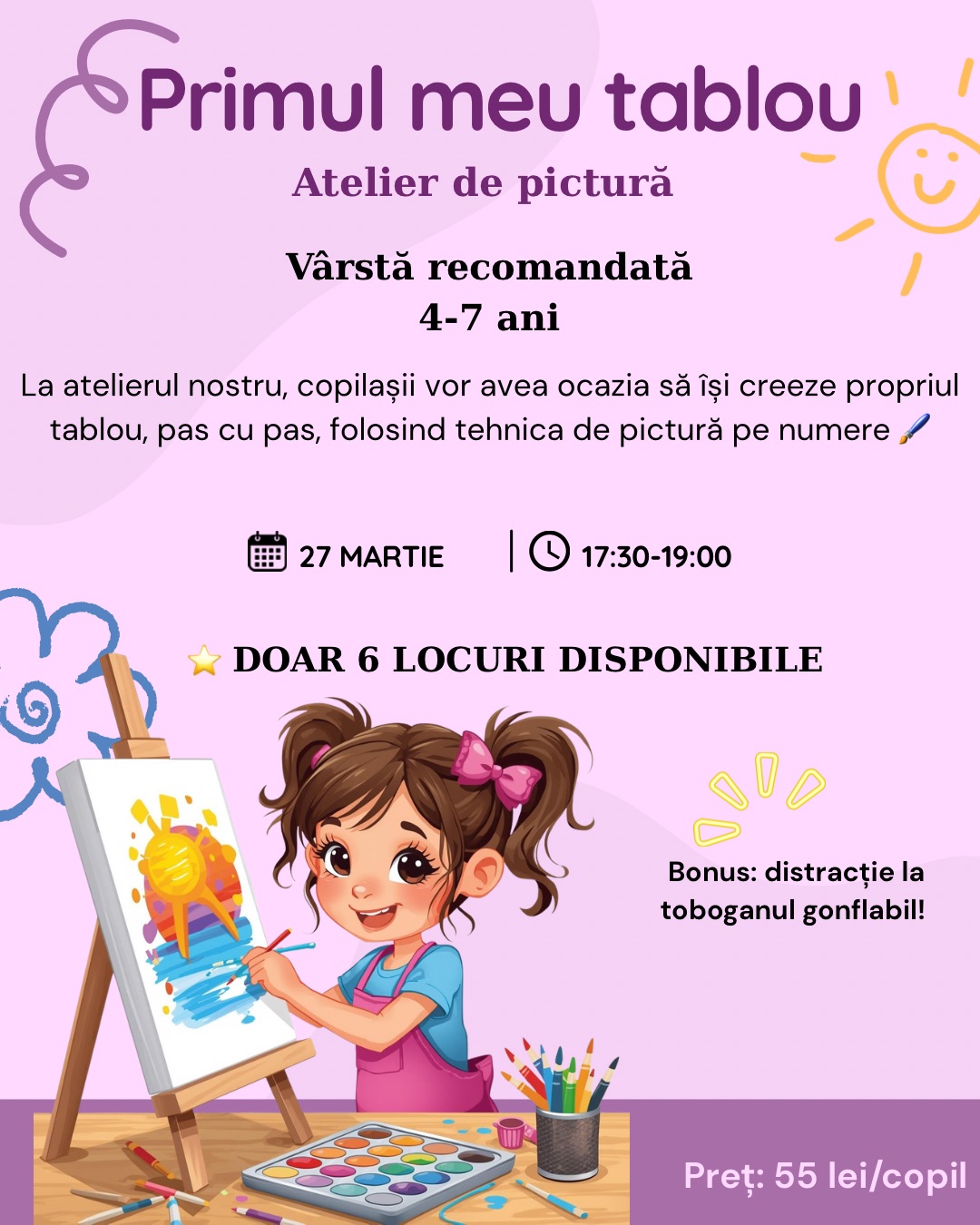 Un atelier în care fiecare copil creează propriul tablou pas cu pas, folosind tehnica picturii pe numere. Tabloul este finalizat în cadrul atelierului, include și rama, iar la final fiecare participant pleacă acasă cu propria creație. După pictură, distracția continuă la tobogane gonflabile.