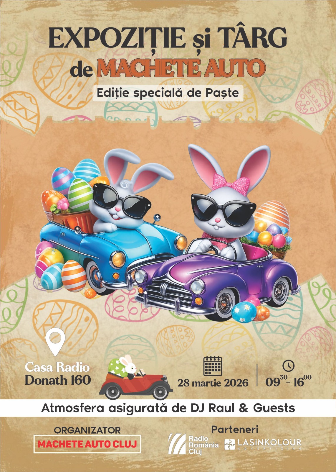 Ediția specială de Paște a Târgului și Expoziției de Machete Auto aduce la Sala Radio Cluj-Napoca expozanți cu o gamă variată de machete și jucării. O destinație perfectă pentru micii pasionați de automobile și pentru colecționarii de orice vârstă, cu atmosferă asigurată de DJ Raul și invitați.