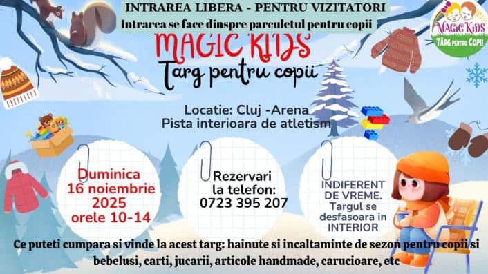 Duminică, 16 noiembrie 2025, suntem așteptați la Târgul Magic Kids la Cluj-Arena, Tribuna 2, pe pista interioară de atletism, între orele 10:00 și 14:00. Este locul perfect unde părinții pot găsi articole de calitate pentru cei mici, iar copiii se pot bucura de o atmosferă caldă și prietenoasă.