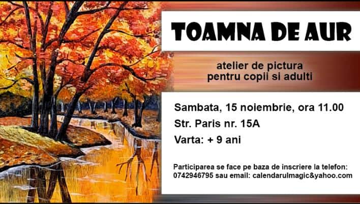 Calendarul Magic vă invită la un atelier artistic dedicat culorilor și farmecului anotimpului aurit: „Toamna de aur”. Copiii și adulții vor picta un peisaj de toamnă pe carton cu pânză, folosind culori acrilice, într-un cadru cald, creativ și prietenos, potrivit pentru întreaga familie.