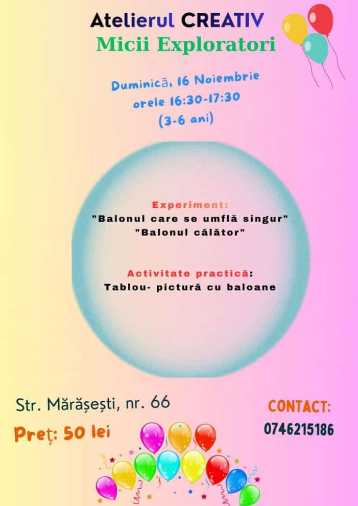 Atelierul Creativ & Micii Exploratori îi invită pe cei mici la o aventură plină de culoare și voie bună! În această ediție, „Experimente cu Baloane” aduce combinația perfectă dintre joacă și descoperire științifică — copiii vor explora lumea fascinantă a baloanelor prin activități interactive și artistice. ✨