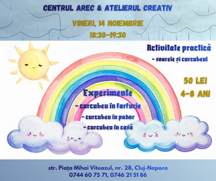 La final, fiecare copil își va crea propriul cer cu soare și curcubeu, o amintire colorată a unei seri pline de descoperiri și bucurie. 🌦️ Atelierul îmbină știința cu arta, oferind o experiență educativă și recreativă pentru copii curioși și pasionați de culoare.