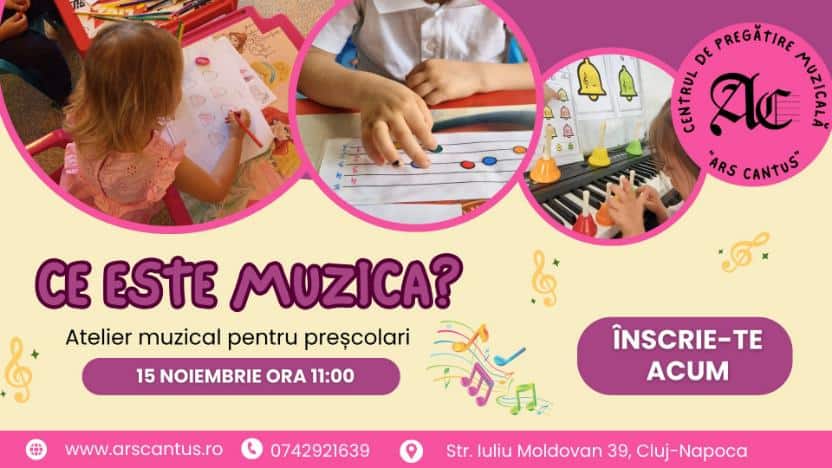 Atelierul „Ce este muzica?” îi așteaptă pe cei mai mici exploratori ai sunetelor la o experiență educativă și plină de bucurie! Copiii cu vârste între 3 și 5 ani vor descoperi, prin joc și experiment, ce este muzica, cum se formează sunetele și cum pot deveni ei înșiși mici artiști.