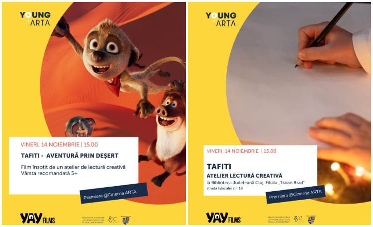 🎬 De la ora 15:00, ne reunim la Cinema ARTA pentru vizionarea filmului „Tafiti – Aventură prin deșert”, o poveste despre prietenie, curaj și descoperirea lumii. Filmul este dublat în limba română, așa că și cei mai mici spectatori sunt bineveniți! ❤️ După proiecție, copiii și părinții sunt invitați să participe la un mic atelier vizual – unde își pot prezenta propriile imagini și idei inspirate de Tafiti.