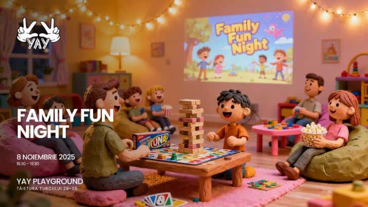 Pe 8 noiembrie, între 16:30 – 19:30, vă așteptăm la o seară dedicată zâmbetelor, jocului și conectării în familie! Începem cu un film family friendly, perfect pentru a intra în atmosfera de relaxare și voie bună. Continuăm cu jocuri de masă, activități ghidate și mici surprize pregătite special pentru voi!
