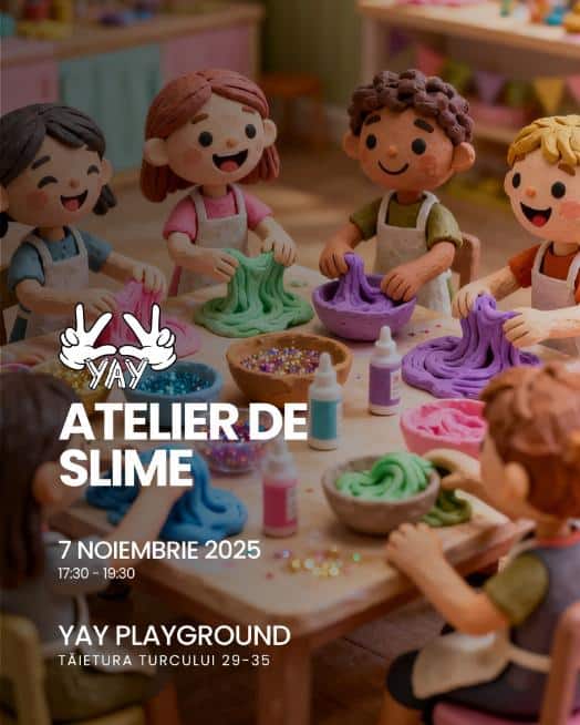 Prima oră este dedicată creației – cei mici vor învăța pas cu pas cum să prepare propriul lor slime personalizat. Urmează joaca liberă, timp în care pot explora, socializa și se pot bucura în voie de noile lor creații. 😄