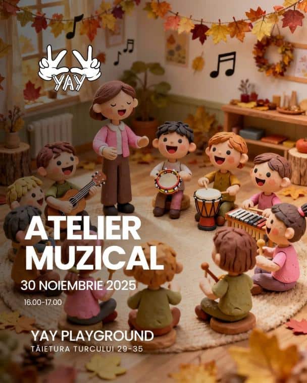 Te așteptăm să explorezi lumea muzicii timp de o oră, într-un atelier plin de ritm, descoperiri și voie bună! Activitatea este concepută special pentru copiii peste 3 ani și îi ajută să-și dezvolte expresivitatea, atenția și bucuria de a crea sunete într-un spațiu prietenos.