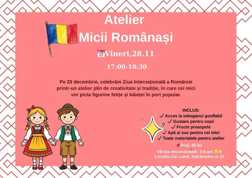 La Zizi Land – where kids play, learn and grow, cei mici sunt invitați să celebreze Ziua Internațională a României printr-un atelier plin de culoare, tradiție și voie bună. Copiii vor picta figurine reprezentând fetițe și băieței în port popular, descoperind simboluri, modele și motive românești într-un mod ludic și accesibil.