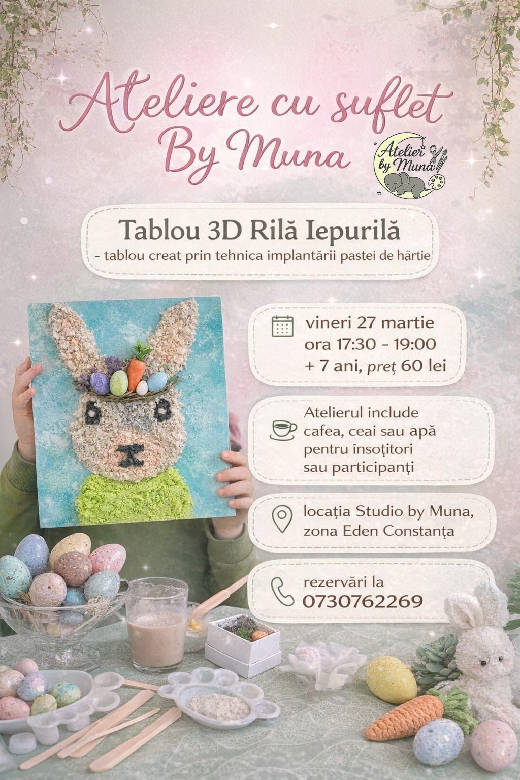 🌸 Există cadouri pe care le cumperi. Și există cadouri pe care mamele le păstrează ani de zile. La acest atelier, copiii vor crea 𝘂𝗻 𝗺𝗶𝗰 𝗼𝗯𝗶𝗲𝗰𝘁 𝗱𝗲 𝗽𝗿𝗶𝗺𝗮𝘃𝗮𝗿𝗮 𝗽𝗹𝗶𝗻 𝗱𝗲 𝗶𝘂𝗯𝗶𝗿𝗲, inspirat de delicatele flori de cireș, simbol al bucuriei și al începuturilor frumoase. Fiecare petală pictată va deveni un „𝗺𝘂𝗹𝘁𝘂𝗺𝗲𝘀𝗰, 𝗺𝗮𝗺𝗮” 𝘀𝗽𝘂𝘀 𝗱𝗶𝗻 𝗶𝗻𝗶𝗺𝗮.