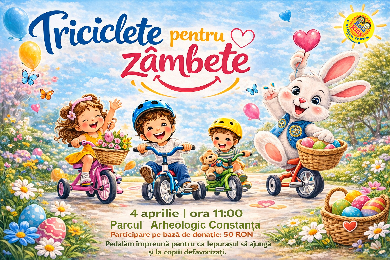 RotaKids Cetatea Tomis Constanța vă invită la un eveniment plin de energie și speranță! „Triciclete pentru zâmbete” nu este doar o cursă veselă, ci o misiune importantă. Anul acesta, copiii noștri pedalează pentru a-l ajuta pe Iepuraș să ajungă și la acei copii pentru care sărbătorile sunt, uneori, mai puțin vesele.
