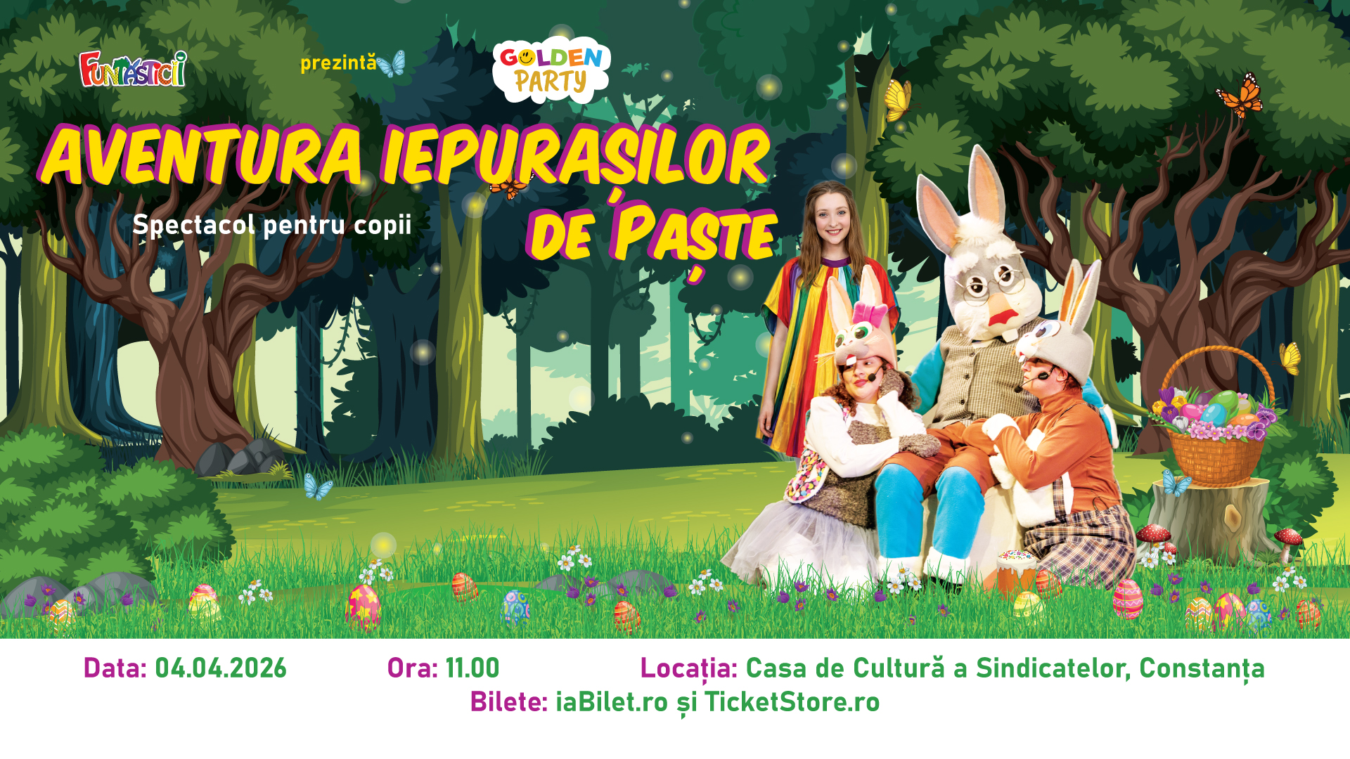 Spectacol de Paște pentru copii Pregătiți-vă pentru o aventură de Paște plină de culoare, mister și multă veselie! Un spectacol magic unde râsetele copiilor devin parte din poveste și unde fiecare mic spectator poate deveni ajutor de iepuraș. Rica și Rilă, doi iepurași drăgălași, sunt preocupați de venirea sărbătorii Paștelui și pregătesc cadouri pentru toți copiii. Dar… vaaai!