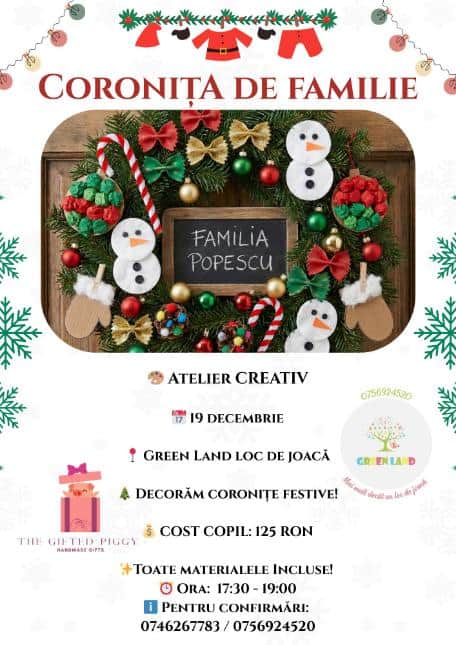 Pe 19 decembrie, la Green Land (loc de joacă) din Iași, copiii sunt invitați la un atelier creativ cu tematică de sărbători: decorăm coronițe festive. Este o activitate potrivită pentru vârsta +4 ani și promite exact ceea ce multe familii caută în decembrie: un timp de calitate, fără grabă, în care copilul creează ceva frumos și util, iar părintele poate rămâne aproape, se poate bucura de atmosferă și, dacă dorește, își poate lua un mic moment de respiro.