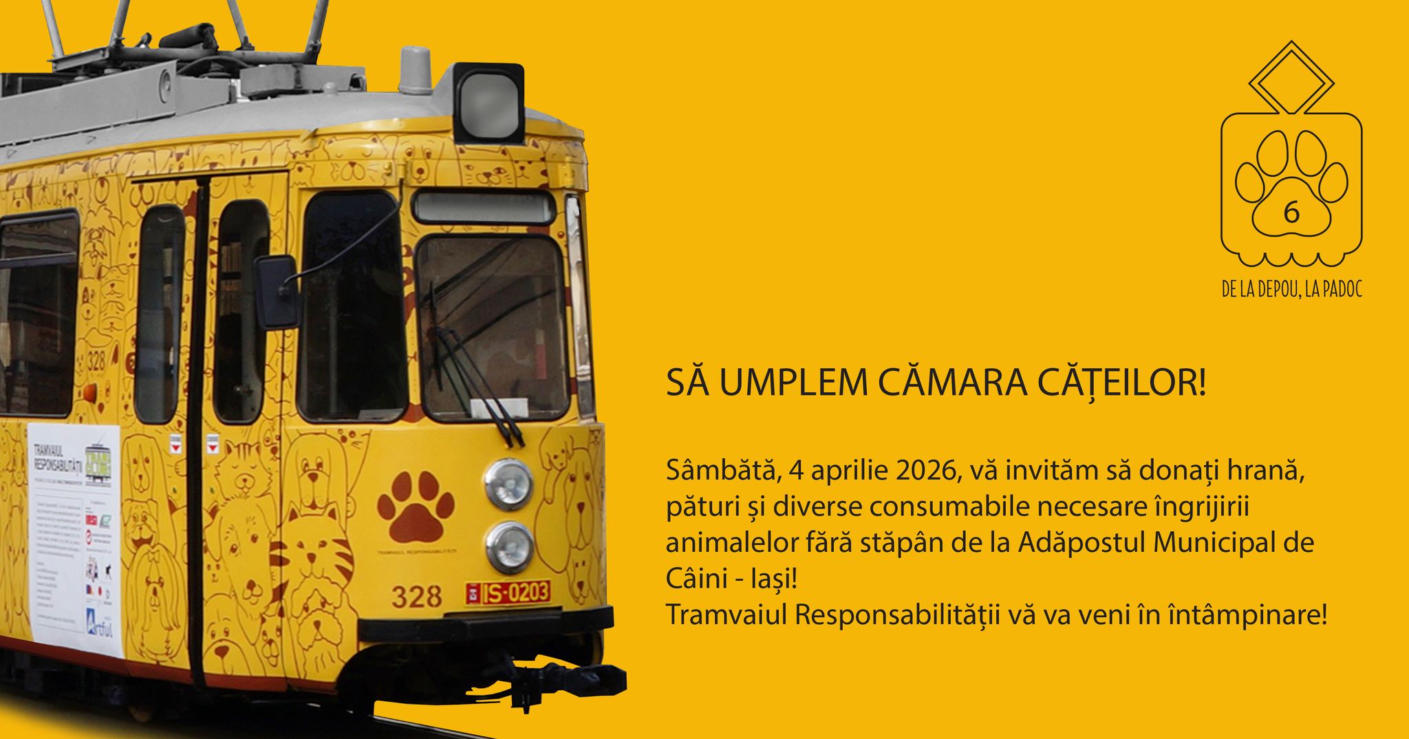 „Tramvaiul Responsabilității” redevine pentru o zi gazda campaniei de strângere de hrană „De la depou, la padoc – Să umplem cămara cățeilor! ”. Sâmbătă, 4 aprilie 2026, de „Ziua internațională a animalelor fără stăpân”, vă invităm să donați hrană pentru căței, pături, diverse bunuri şi consumabile necesare traiului zilnic.