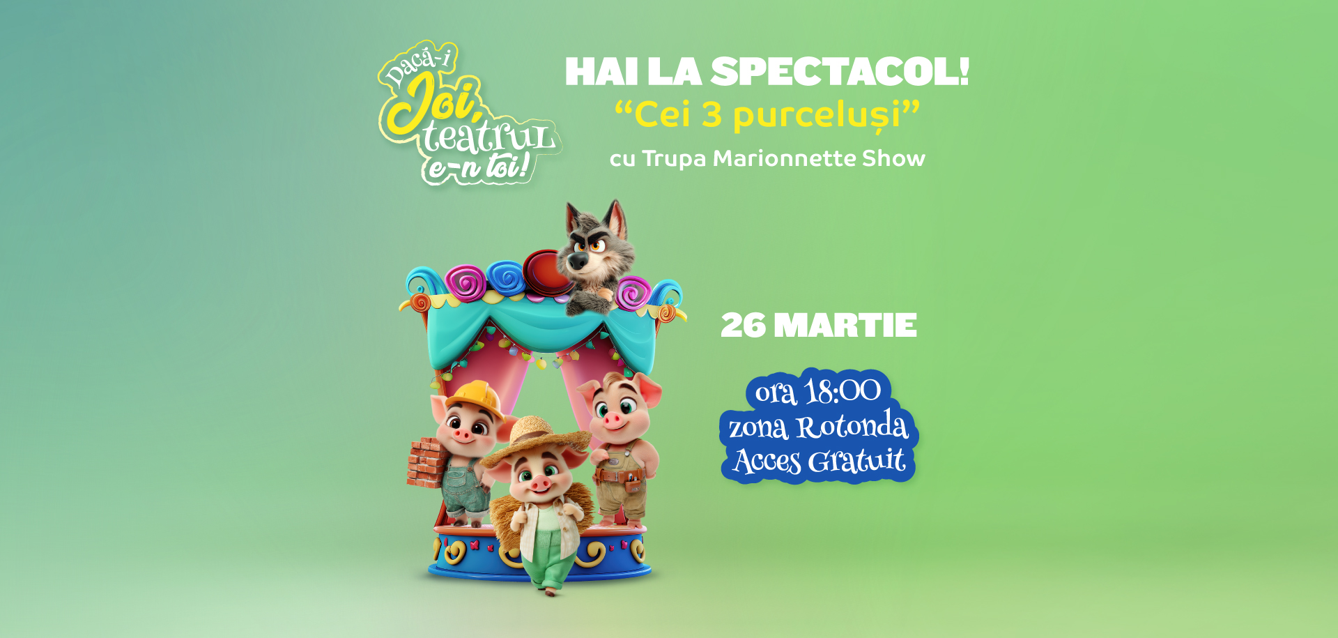 O versiune actuală, dinamică și sensibilă a unei povești pe care copiii o iubesc dintotdeauna. „Cei trei purceluși… altfel” îmbină joaca și emoția, fantezia și realitatea copilăriei, într-un spectacol care vorbește despre curaj, responsabilitate și prietenie fără morală apăsătoare, ci cu zâmbet și prospețime.