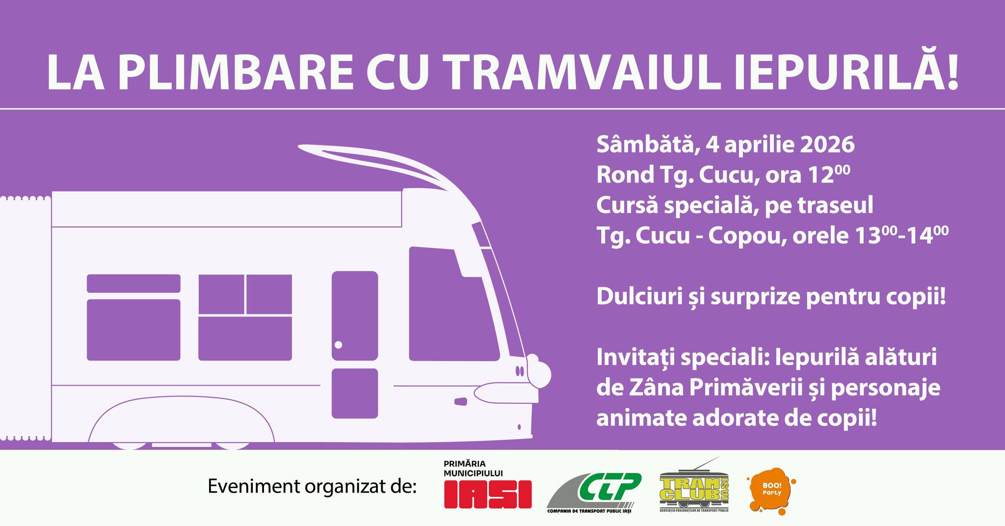 Sâmbătă, 4 aprilie 2026, ora 12:00, vă așteptăm în Rond Târgu Cucu, pentru o nouă întâlnire plină de surprize cu Tramvaiul Iepurilă. Acesta va veni însoțit de însuși Iepurilă și prietenii săi, ce vor oferi dulciuri celor mici. De acolo, va circula pe traseul Târgu Cucu – Copou până la ora 14:00, cu oprire în fiecare stație. Dar bucuria nu se oprește aici!