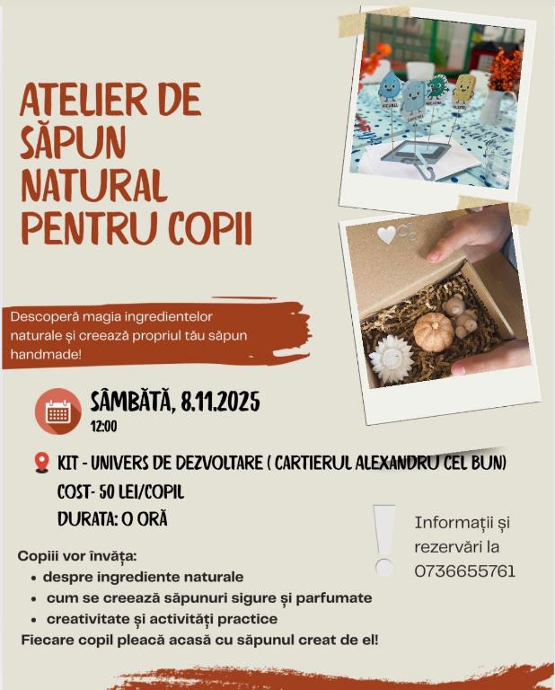 KIT invită toți micii curioși la un atelier creativ unde știința, natura și arta se împletesc în cel mai frumos mod! Copiii vor pătrunde în lumea minunată a săpunurilor naturale și vor descoperi cum pot crea ceva frumos și util, chiar cu propriile mâini. 💫