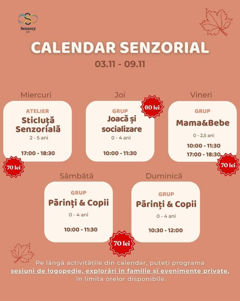 🍂 Calendarul Senzorial revine la Sensory Life – Centrul senzorial din Iași, locul unde te simți copil, indiferent de vârstă! 💫 Între 3 și 9 noiembrie, te așteaptă o săptămână plină de experiențe care trezesc simțurile și aduc zâmbete celor mici și mari deopotrivă.
