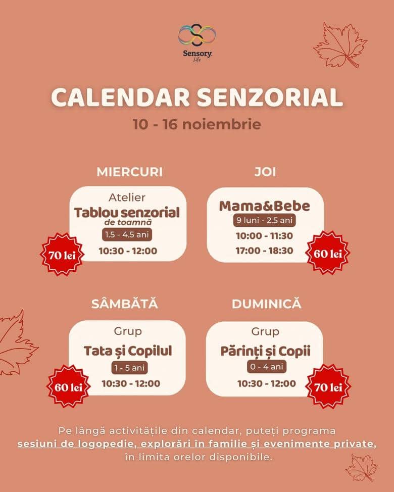 🍂 Calendarul Senzorial revine la Sensory Life – Centrul senzorial din Iași, locul unde te simți copil, indiferent de vârstă! 💫 Între 3 și 9 noiembrie, te așteaptă o săptămână plină de experiențe care trezesc simțurile și aduc zâmbete celor mici și mari deopotrivă.