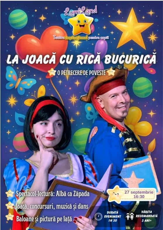 Este sâmbătă după-amiază și joaca își caută prietenii! La LumiLand – Teatru pentru copii, Rică Bucurică îi invită pe cei mici la o aventură de poveste, unde imaginația, expresivitatea și zâmbetele devin ingredientele principale. Spectacol-lectură interactiv inspirat din povestea Albă ca Zăpada și cei șapte pitici, în care copiii devin protagoniștii poveștii, în rolul piticilor.