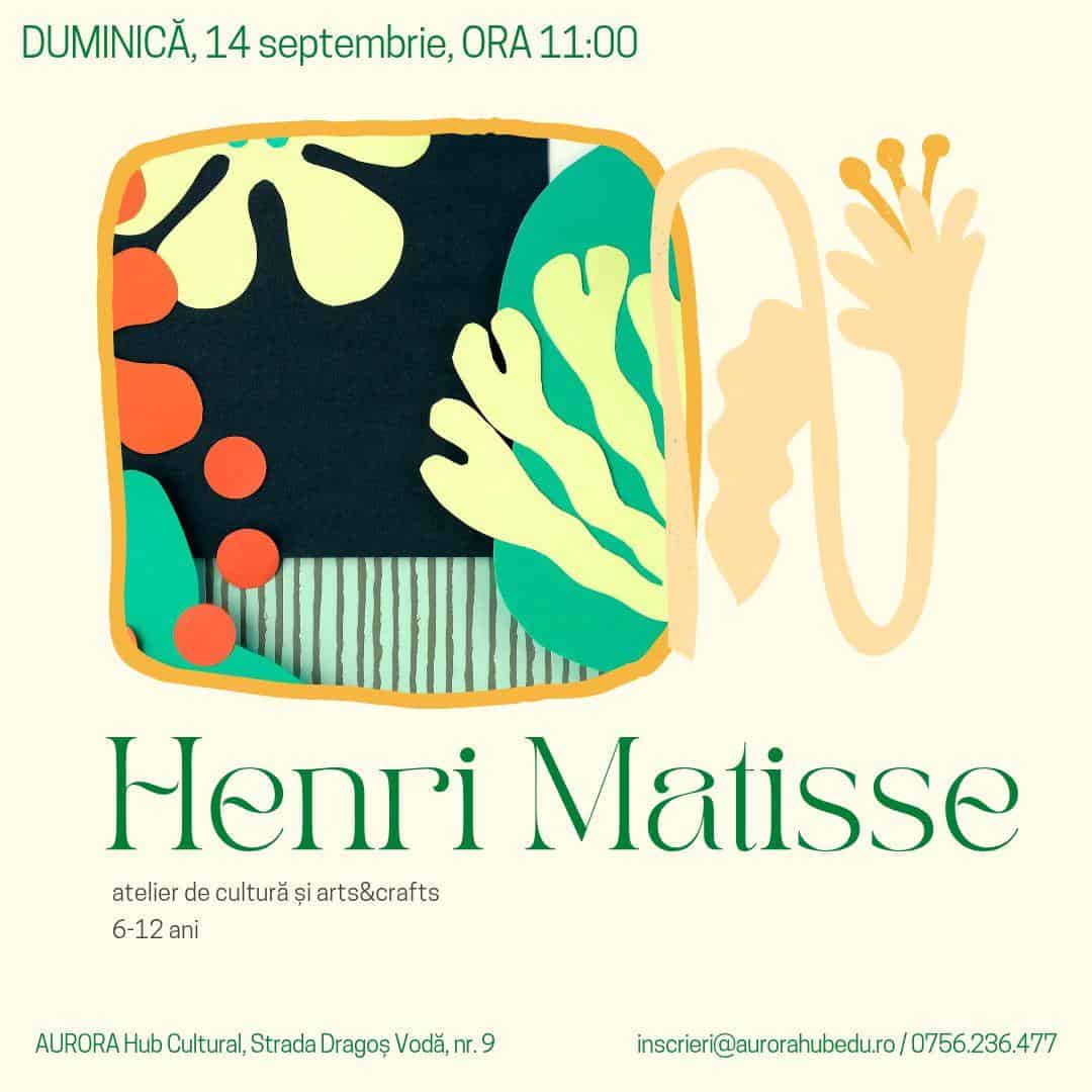 În cadrul acestui atelier-eveniment, copiii sunt invitați să descopere universul capodoperelor lui Henri Matisse, pictorul francez care a revoluționat arta secolului XX prin culori vii și forme expresive. Vom porni cu proiecții pe pânză pentru a stârni curiozitatea, discuții interactive și materiale vizuale (albume, printuri), iar apoi fiecare copil va crea propriul colaj inspirat de stilul lui Matisse, folosind materiale arts&crafts.