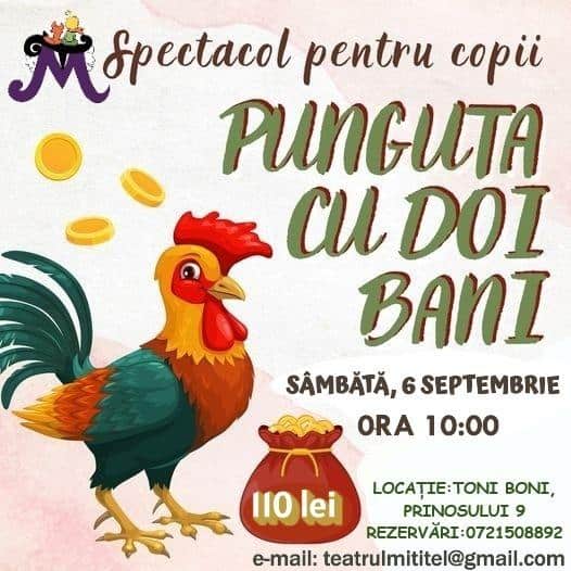 Sâmbătă, 6 septembrie, de la ora 10:00, Teatrul Mititel vă invită la spectacolul interactiv cu atelier „Punguța cu doi bani”. O poveste veche spusă altfel: un moș cu un cocoș perseverent și curajos, o babă și găina ei… iar la final ne prindem în horă,
