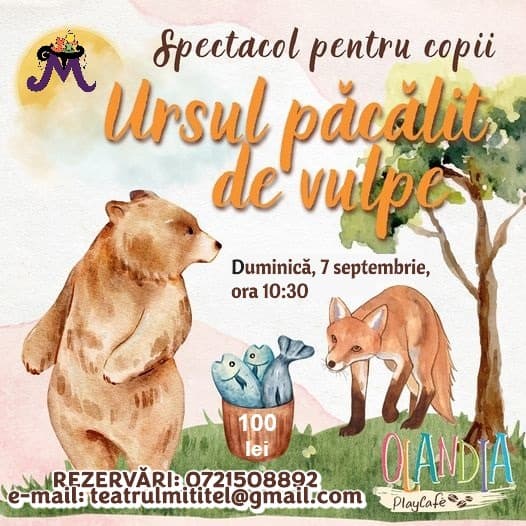 Duminică, 7 septembrie, de la ora 10:30, vă invităm la spectacolul atelier „Ursul păcălit de vulpe”, recomandat copiilor cu vârste între 1–7 ani. Într-o baltă înghețată, păcălit de vulpea roșcată, ursul și-a lăsat coada… iar acum umblă supărat, mormăind neîncetat: „Nu e bine să te-ncrezi în orișicine.”