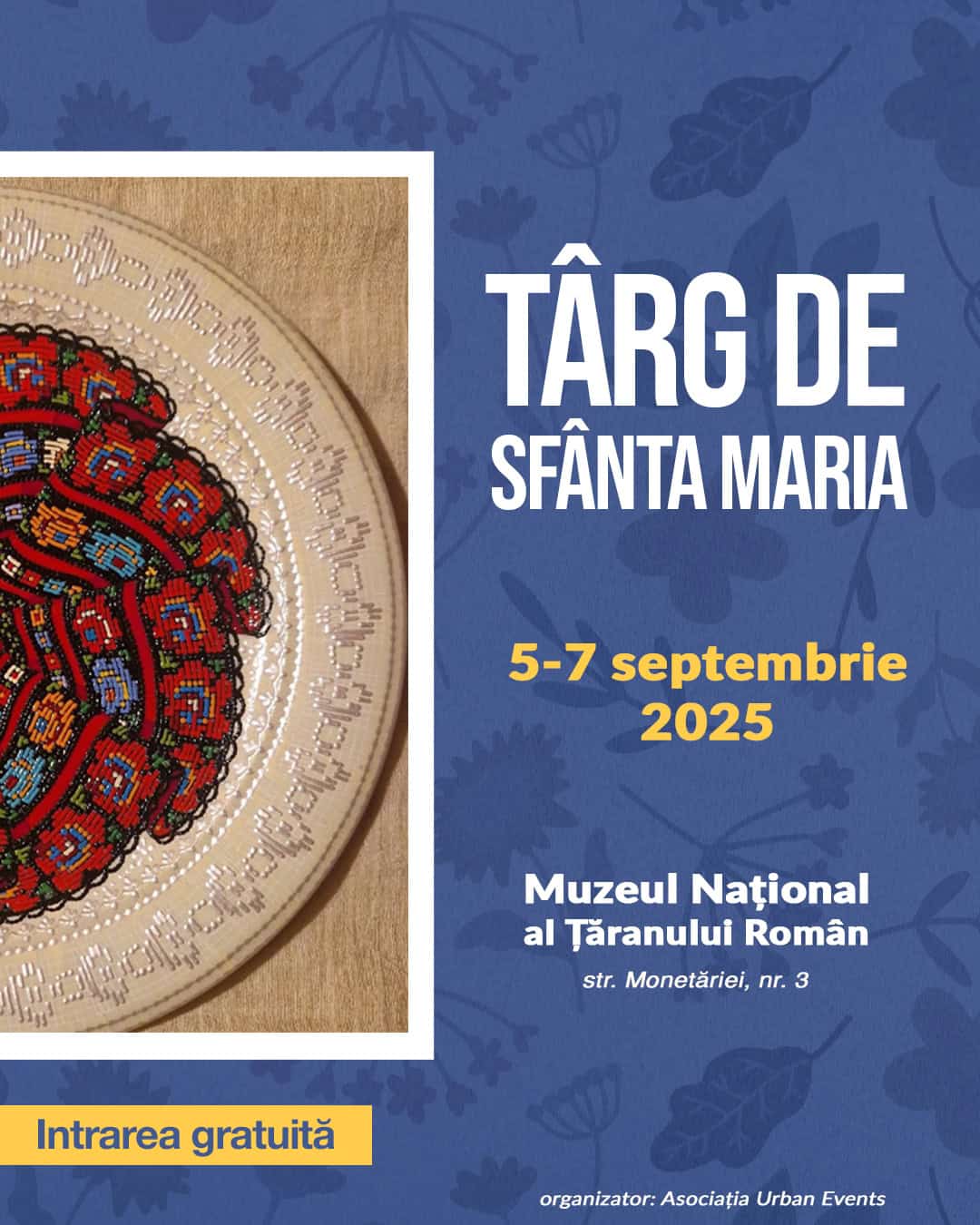 În perioada 5 – 7 septembrie 2025, între orele 10:00 și 19:00, Muzeului Național al Țăranului Român vă invită la Târgul de Sfânta Maria Mică, organizat în curtea muzeului din București (Str. Monetăriei nr. 3). Intrarea este liberă.